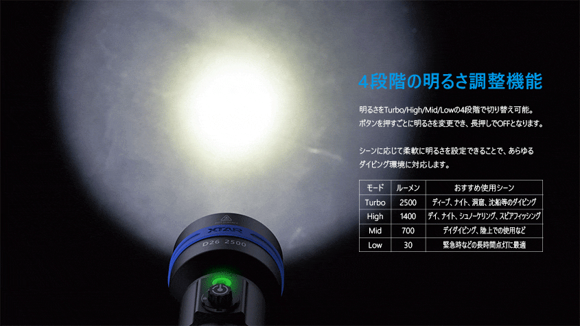 ・光束:ターボ 2500lm / 強 1400lm / 中 700lm / 弱 30lm